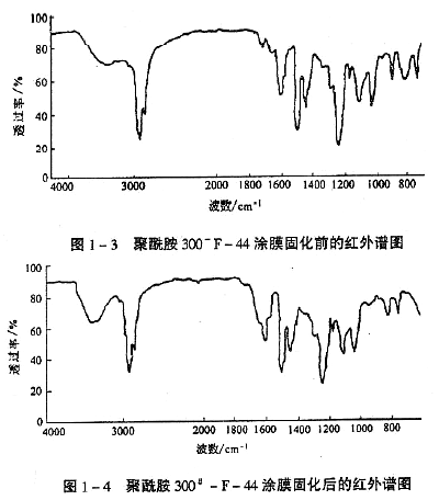 紅外譜圖1-3~圖1-6表明,聚酰胺300#—F-44涂膜固化前,在910cm-1處有環氧基伸展振動吸收峰,固化后,環氧吸收峰消失。在3400cm-1處出現明顯的羥基伸展振動吸收峰;聚酰胺300#—E-44涂膜固化前后也得到同樣結果。其他環氧樹脂涂膜的環氧基全部消失、羥基明顯增加,證明表1-5中的所有環氧清漆涂膜都達到充分完全固化,這里不予重述。