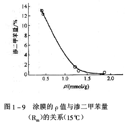 環氧涂膜的ρ定量反映涂膜交聯固化程度,Mc定性反映涂膜交聯固化網絡孔徑大小。由計算和試驗得知,ρ值大(Mc值小)的環氧涂膜,對滲透介質穿透涂膜的抵擋作用強,則滲透介質對環氧涂膜的滲透量(Rm)小;ρ值小(Mc值大)的環氧涂膜,對滲透介質穿透涂膜的抵擋作用弱,則滲透介質對環氧涂膜的滲透量(Rm)大。當把幾種不同ρ值的環氧涂膜浸泡在二甲苯中時,其結果如圖1-9所示。