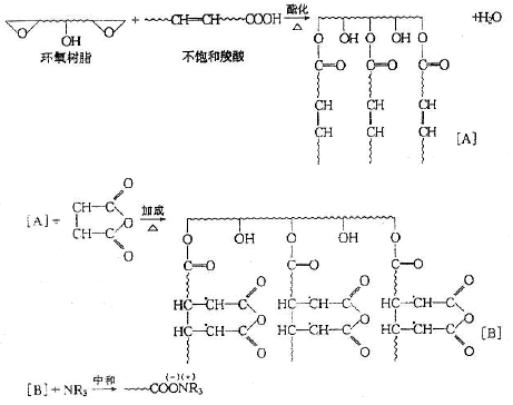 ![]() 制備陰離子型樹脂時,一般選用羥基含量較高的環(huán)氧樹脂作為骨架結(jié)構(gòu)材料。環(huán)氧樹脂與酸、酸酐反應,經(jīng)胺中和后得到水溶性陰離子型樹脂: