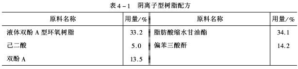 水溶性陰離子型樹脂與六甲氧基三聚氰胺等交聯(lián)劑配合,會提高涂膜的有效交聯(lián)密度(ρ)、改進耐蝕性。水溶性陰離子型樹脂分子鏈上剩余的雙鍵、羥基和羧基等活性基團與其他官能團反應,可達到改性目的。用酚醛樹脂可提高耐化學藥品性,用苯乙烯可提高硬度并增強耐電壓性及對金屬部件磷化層的適應性。利用液體環(huán)氧樹脂制備水溶性陰離子型樹脂配方見表4-1。