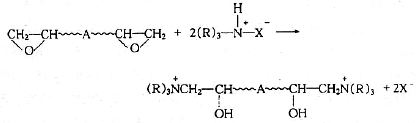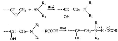 有時,可用環(huán)氧樹脂先與異氰酸酯預聚物或丙烯酸聚合物反應,得到含羥基、羧基和氨(胺)基的樹脂,形成環(huán)氧胺離子的過程如下: