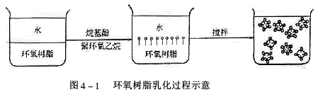 在制造環(huán)氧樹脂乳液時,可選用非離子型的烷基酚聚環(huán)氧乙烷作乳化劑,它含有憎水基烷基酚和親水基聚環(huán)氧乙烷(醚鍵)。當環(huán)氧樹脂和水加在一起時,因不相溶其分成兩層,加入烷基酚聚環(huán)氧乙烷后,親水基聚環(huán)氧乙烷溶于水,而憎水基烷基酚溶于環(huán)氧樹脂,經(jīng)攪拌后使環(huán)氧樹脂變成為微粒子分散在水中,得到穩(wěn)定的環(huán)氧樹脂乳液。環(huán)氧樹脂乳化過程如圖4-1所示。