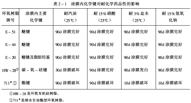(1)涂膜內的化學鍵及極性基團涂膜內含有酯鍵時,耐化學藥品性極差;涂膜內含有碳-氧-硅鍵時,降低耐汽油性和耐鹽水性;涂膜內含有醚鍵和脂肪族羥基時,耐化學藥品性優良;含有煤焦瀝青的涂膜有優異的耐酸堿性及耐水性。