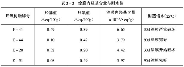 當用300#聚酰胺作固化劑、水楊酸作固化促進劑時,與幾種雙酚A型環氧樹脂在30~35℃下進行交聯固化反應。涂膜內羥基含量與耐水性關系見表2-2。