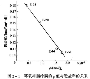 用300聚酰胺作固化劑,取胺當量:環氧當量=0.5:1,計算幾種環氧涂膜的ρ值并由試驗測得透鹽率,結果如圖2-1所示。