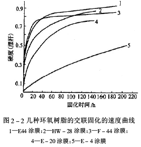 用聚酰胺300#作固化劑,水楊酸作固化促進劑,胺當量:環氧當量=0.5:1,固化溫度為30~35℃,不同品種環氧樹脂的交聯固化的速度曲線見圖2-2。