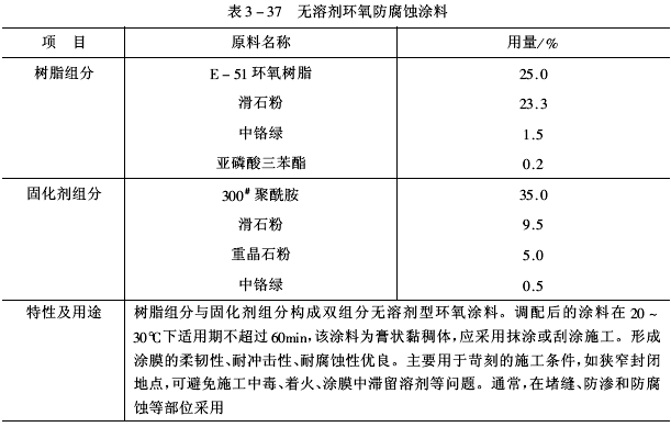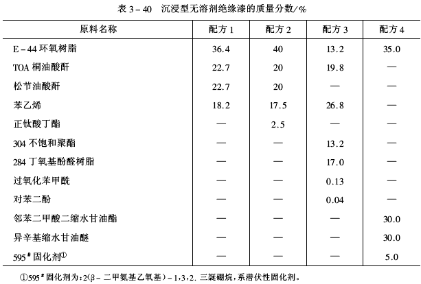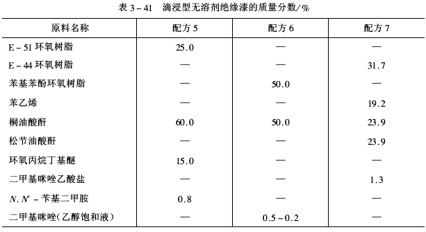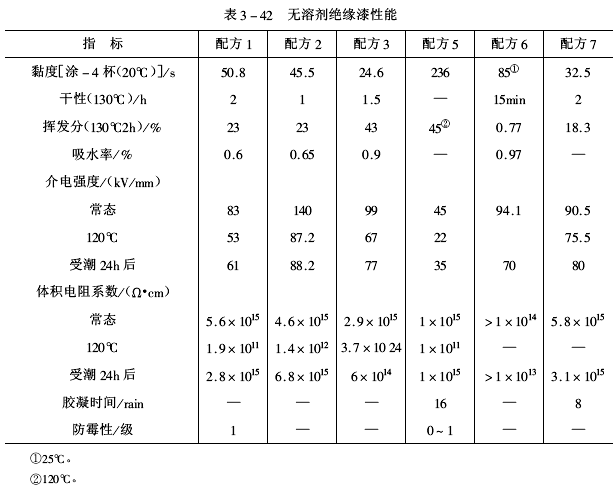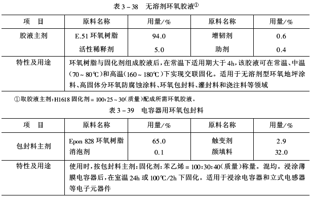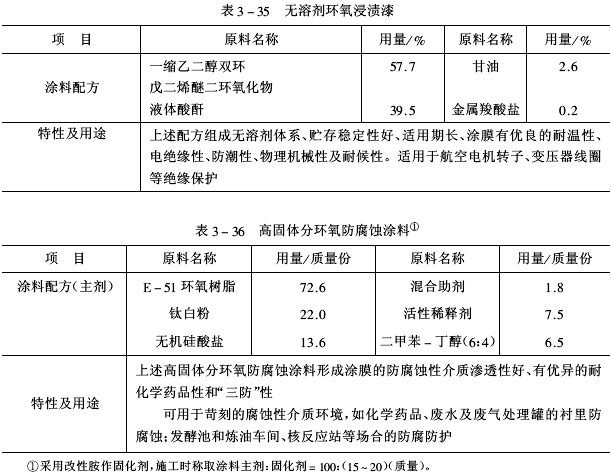 無溶劑型環氧浸漬漆見表3-35,高固體分環氧防腐蝕涂料見表3-36,無溶劑型環氧防腐蝕涂料見表3-37,無溶劑型環氧膠液見表3-38,電容器用環氧包封料見表3-39,沉浸型無溶劑絕緣漆見表3-40,滴浸型無溶劑絕緣漆見表3-41,無溶劑絕緣漆性能見表3-42。
