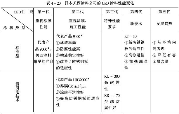 ![]() ②日本關西涂料公司的CED涂料日本關西涂料公司是在引進PPG公司的CED涂料基礎上開發的CED體系,其各代CED涂料性能變化見表4-20。