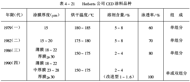 ![]() (2)Hoechst系列CED涂料 Hoechst系列CED涂料是以Herberts公司CED涂料為代表,其發展速度很快,主要有四代產品,各代產品主要性能見表4-21。國外CED涂料的涂膜由薄到厚。泳透率由低到高,烘烤溫度由高到低,有機溶劑含量逐漸減少。