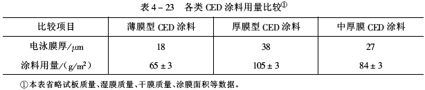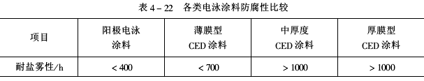 ①高泳透率的中厚膜CED涂料日本生產的PTU-600 CED涂料,在保持所需泳透性前提下改變泳涂條件(槽液溫度、泳涂電壓和時間),使涂膜厚度可在20~40μm范圍內自由選定。該涂料可以實現薄膜(≤20μm)、中厚膜(20~30μm)和厚膜(>30μm)三種要求。各類電泳涂料防腐性比較如表4-22所示。