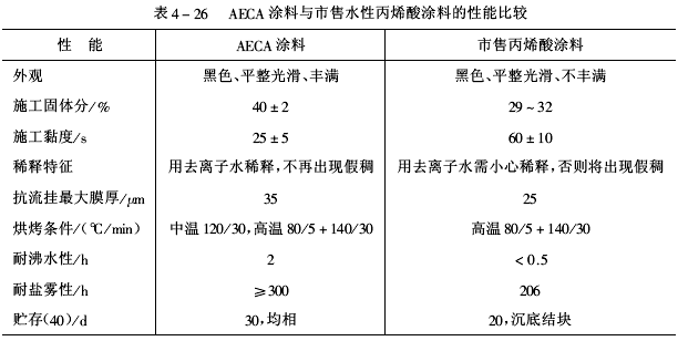水性環氧丙烯酸酯共聚物涂料。合成的水性環氧改性丙烯酸樹脂,有效地克服了施工出現的“假稠”,提高了水性丙烯酸涂料的耐蝕性。水性環氧丙烯酸酯共聚物涂料(AECA涂料)與市售水性丙烯酸涂料性能比較見表4-26。