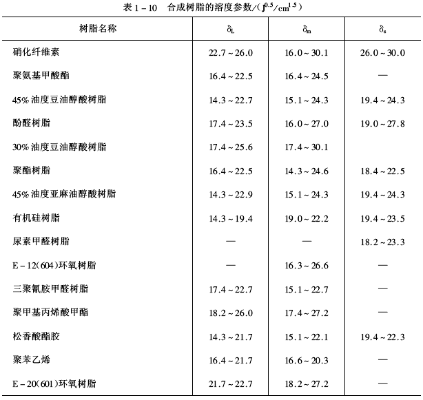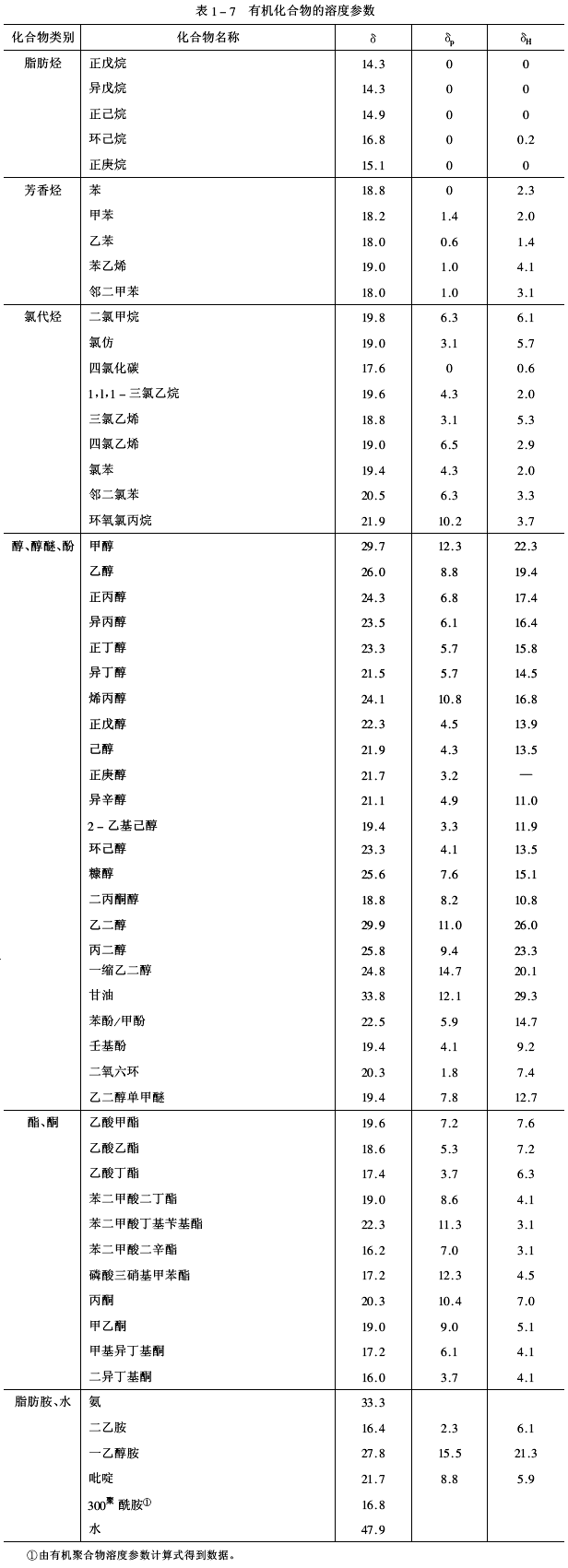 。δ、δH和δp參數見表1-7,溶度參數的單位:J0.5/cm1.5(1J0.5/cm1.5=103J0.5/m1.5)。