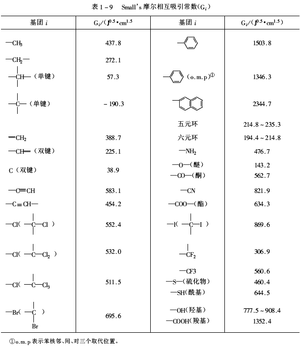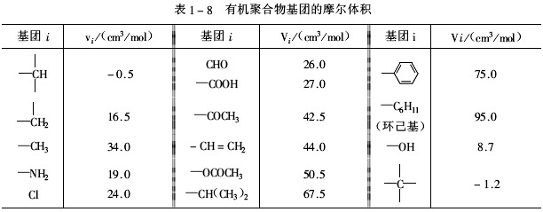 有機聚合物基團的摩爾體積見表1-8;Small's摩爾相互吸引常數見表1-9。