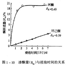 介質對環氧涂膜的滲透量(Rm)隨δR增加而增大,即δR值越大,環氧涂膜抵擋滲透介質穿透能力越弱,Rm值越大;δR值越小,環氧涂膜抵擋滲透介質穿透能力越強、Rm值越小。配方6涂膜的滲酮、酯試驗結果如圖1-10和圖1-11所示。