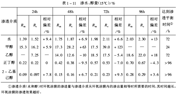 水和醇對環氧涂膜(配方6)的滲透量結果見表1-11。
