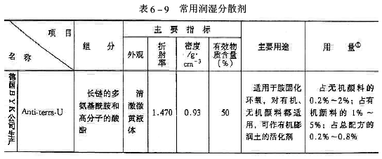 五、潤濕分散劑 潤濕分散劑用于促進基料對顏料的潤濕及分散。顏料良好的潤濕分散,是配漆的重要部分。 顏料分散從機理上可分為三部分:①濕潤:樹脂溶劑取代顏料表面的空氣;②分散:利用機械能量以高剪切力將顏料聚集體分散為單獨粒子;③穩定:已分散的顏料粒子保持分散狀態,不出現絮凝、反粗現象。 上述三部分中又以穩定最重要。若顏料分散后不穩定,將出現諸如光澤不良、沉淀、浮色發花等弊病。潤濕分散劑的功用主要在于穩定,同時對濕潤及分散亦有效用。 溶劑型環氧涂料所用潤濕分散劑主要為長鏈多氨基酰胺和高分子酸酯的鹽,如BYK公司生產的DISPER BYK-163,對環氧高固體分涂料有非常好的潤濕分散作用。按顏料量計算,有機顏料使用量為1.0%~5.0%;無機顏料為0.2%~2.0%;總漆量的0.1%~1.0%;浙江臨安化工廠生產的CP-88(一種磷酸酯鹽)在涂料中使用除具有潤濕作用外,還具有良好的防沉效果。無機顏料用量為0.3%~0.8%,總漆量的12%~0.5%。國內環氧樹脂常用的潤濕分散劑見表6-9。