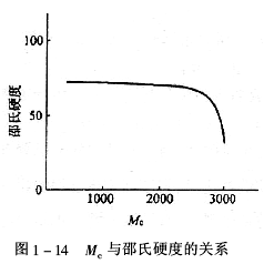 2.Mc與硬度采用上面五種胺與環(huán)氧樹脂形成涂膜的邵氏硬度與Mc的關(guān)系,也在Mc=2400附近出現(xiàn)突變,是由于涂膜的有效交聯(lián)密度低到一定限度后而產(chǎn)生柔韌性突變所致。如圖1-14所示。