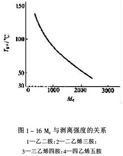 ![]() ![]() 由圖1-16知,四種固化劑與環(huán)氧樹脂形成涂膜的剝離強(qiáng)度,在Mc=2400附近出現(xiàn)極大值,這種現(xiàn)象與圖1-13、圖1-14及圖1-15性能突變相似。