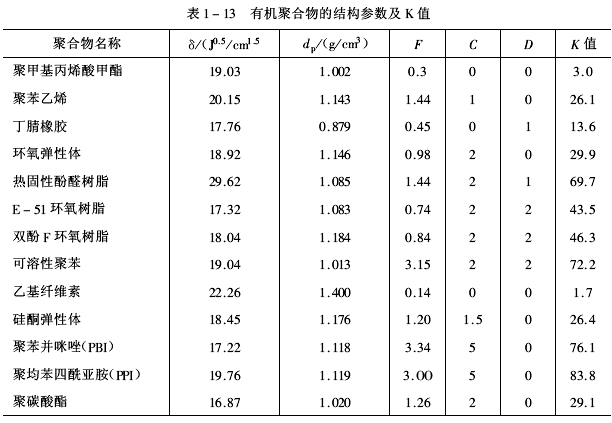 在任何情況下δF值都大于零。當(dāng)δC=δD=0時(shí),聚合物的耐(抗)燒蝕性差。通常,在選擇耐燒蝕性聚合物時(shí),應(yīng)保證C和D都有較大的數(shù)值,以獲得好的燒蝕隔熱效果。有機(jī)聚合物的結(jié)構(gòu)參數(shù)及K值見表1-13。