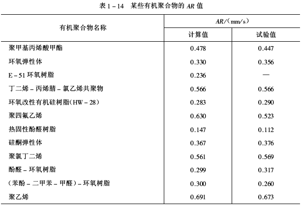 理論計(jì)算的AR值和試驗(yàn)測定的AR值基本相符。通過理論計(jì)算和試驗(yàn)測定都能較準(zhǔn)確地選擇燒蝕隔熱涂料的基料,而理論計(jì)算是一種更快捷有效的選材方法,可以縮短時(shí)間、提高效率。某些有機(jī)聚合物的AR值見表1-14。