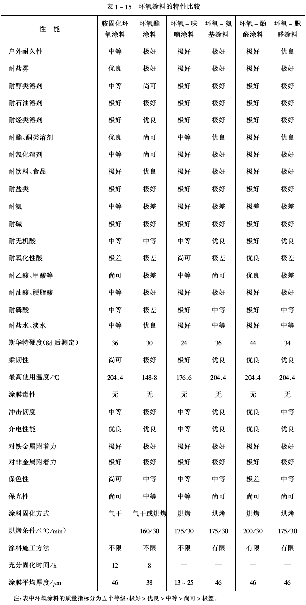 不同固化體系形成的環(huán)氧涂膜具有不同的性能。環(huán)氧涂料優(yōu)異的粘接性、耐化學(xué)藥品性、防腐蝕性和耐水性等特性,有的性能是其他涂料品種望塵莫及的。環(huán)氧涂料是許多領(lǐng)域不可缺少的材料。環(huán)氧涂料的特性能否充分展示,取決于環(huán)氧樹脂的結(jié)構(gòu)、固化劑的性質(zhì)及固化條件、各種助劑的功效等因素,這是環(huán)氧涂料配方設(shè)計(jì)時(shí)應(yīng)解決的問題。盡管環(huán)氧涂料有許多優(yōu)點(diǎn),但其戶外耐候性和耐含氧酸性差,為克服上述缺點(diǎn),已有新品種問世。環(huán)氧涂料的特性比較見表1-15。