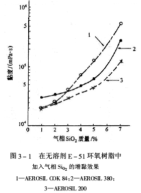 ![]() ![]() (4)觸變劑 觸變劑(thixotropie agent)是一種具有很大表面的不溶性添加劑。氣相二氧化硅的表面和流動態聚合物母體之間有形成氫鍵的可能性,因此,它是最有效的觸變劑之一。高分散性的氣相二氧化硅(商品名氣溶膠,俗稱白炭黑)在無溶劑型環氧樹脂體系中起到明顯的觸變效果,三種AEROSIL氣相二氧化硅對未改性無溶劑型環氧樹脂的增加觸變性結果如圖3-1所示。