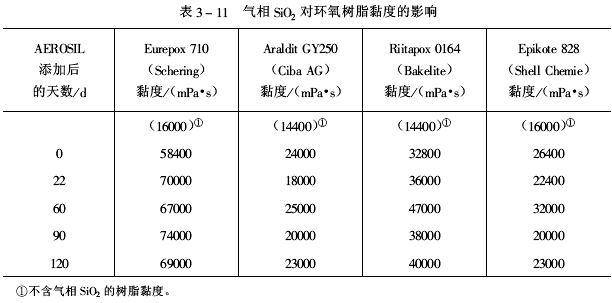 ![]() 在幾種不同牌號的環氧樹脂中加入2%(質量分數)的氣相SiO2,其黏度變化見表3-11。