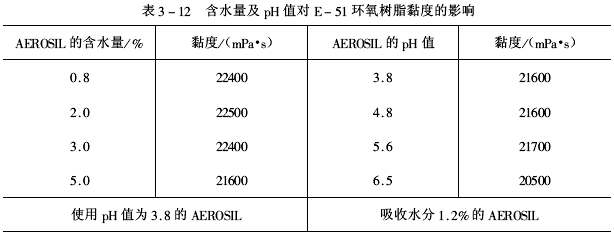 氣相SiO2的含水量及pH值對E-51環氧樹脂黏度的影響(SiO2加入量為環氧樹脂的2%)見表3-12。