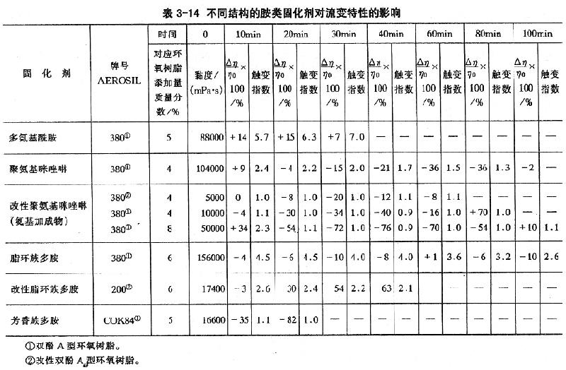 ![]() ![]() 在雙酚A型環氧樹脂和改性雙酚A型環氧樹脂中添加氣相SiO2后,再加入不同結構的胺類固化劑,考察體系的流變特性,結果列于表3-14。