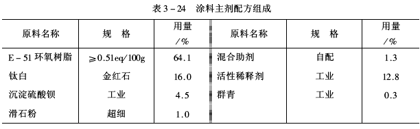 無溶劑型環(huán)氧飲水艙涂料主劑由E-51環(huán)氧樹脂、鈦白粉、填料、活性稀釋劑和助劑等組成,見表3-24。