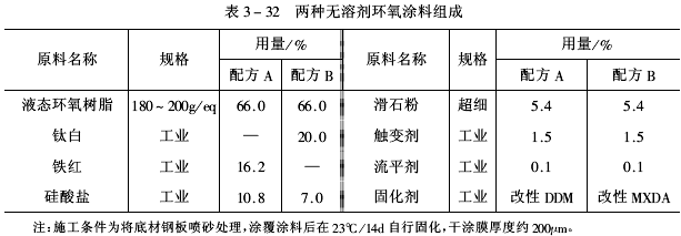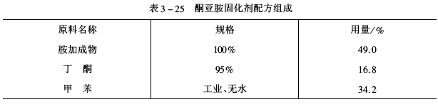 ![]() 無溶劑環(huán)氧飲水艙涂料采用酮亞胺作固化劑,其配方組成見表3-25。