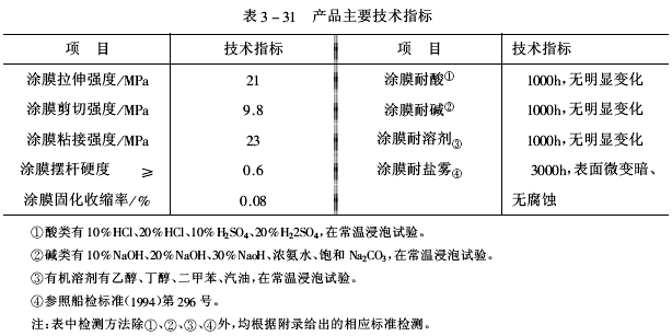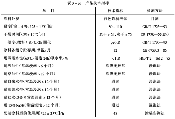 飲水艙涂料適用期長,便于在艙體內(nèi)施工。涂膜有優(yōu)良的耐水性、耐堿性、耐油性、耐鹽水性和“濕態(tài)”附著性等。產(chǎn)品技術(shù)指標(biāo)見表3-26。