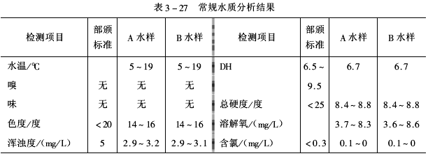 ![]() (2)常規(guī)水質(zhì)分析將環(huán)氧酮亞胺涂料涂覆水柜的水和環(huán)氧聚酰胺涂料涂覆水柜的水分別定為A水樣和B水樣。表3-27涂有兩種涂膜的水柜在貯存自來水90d內(nèi)定期取樣測定,常規(guī)水質(zhì)分析結(jié)果見表3-27。