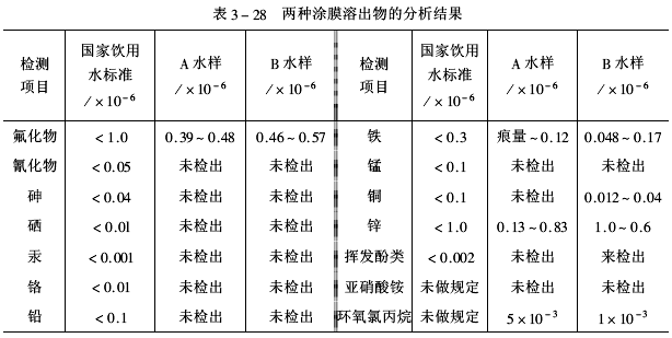 ![]() (3)涂膜釋放物分析從涂有兩種涂膜的水柜內(nèi)定期取出水樣,對兩種涂膜溶出物進(jìn)行分析,其結(jié)果見表3-28。