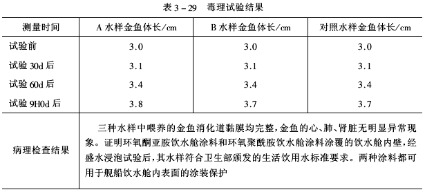 ![]() (4)毒理試驗(yàn) 取浸泡水柜的水和對照用水,進(jìn)行喂養(yǎng)金魚試驗(yàn),觀測金魚生長狀況,其結(jié)果見表3-29。