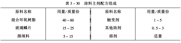 (1)配方組成環(huán)氧玻璃鱗片涂料主劑由混合環(huán)氧樹脂、玻璃鱗片、顏填料、觸變劑及其他助劑組成,見表3-30。