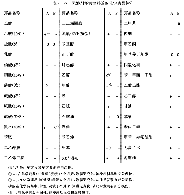 現(xiàn)選用改性的DDM和改性的MXDA(間二甲苯二胺)作固化劑,配制兩種無溶劑環(huán)氧涂料并比較其耐化學(xué)藥品性,見表3-32和表3-33。