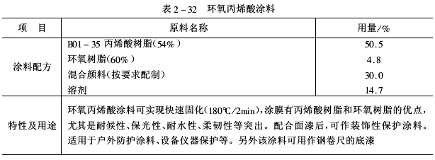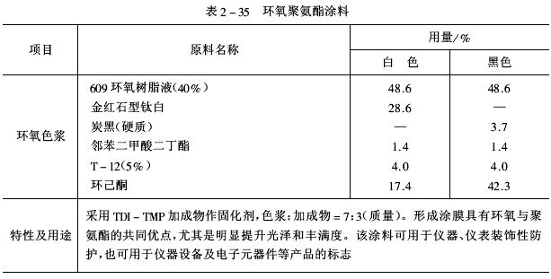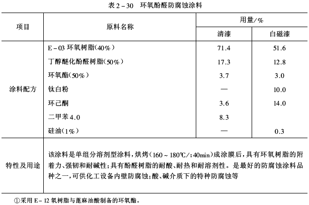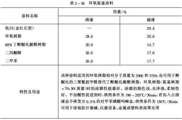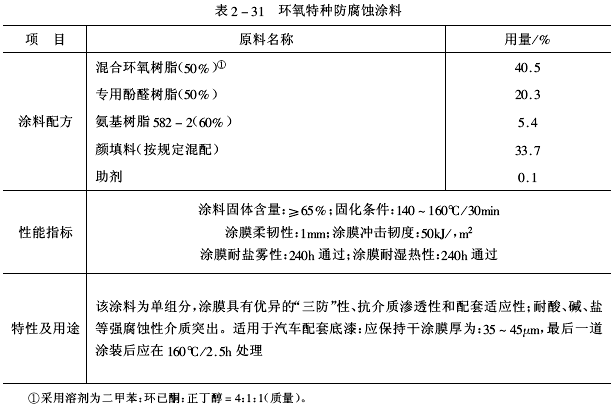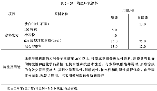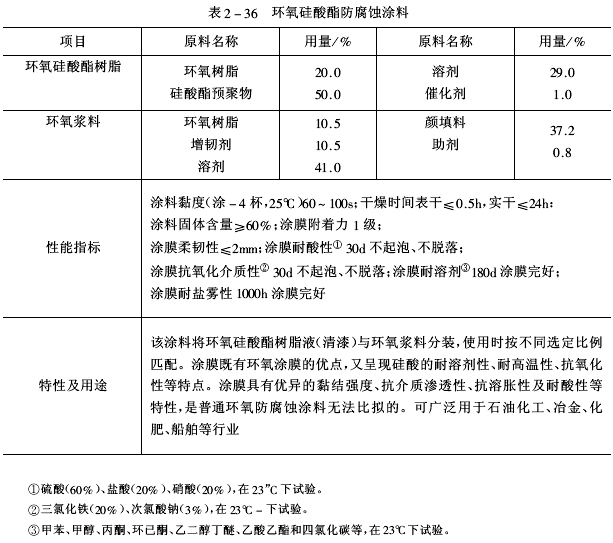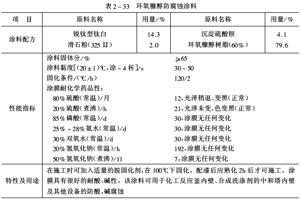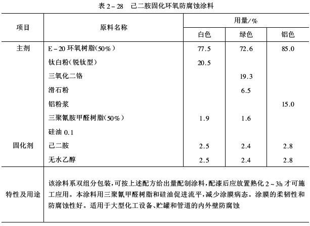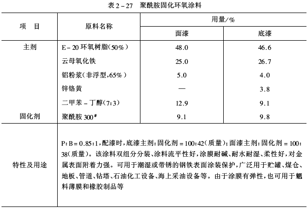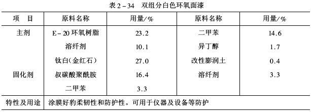 聚酰胺固化環氧涂料見表2-27,己二胺固化環氧防腐蝕涂料見表2-28,線型環氧涂料見表2-29,環氧酚醛防腐蝕涂料見表2-30,環氧特種防腐蝕涂料見表2-31,環氧丙烯酸涂料見表2-32,環氧糠醇防腐蝕涂料見表2-33,雙組分白色環氧面漆見表2-34,環氧聚氨酯涂料見表2-35,環氧硅酸酯防腐蝕涂料見表2-36,H9408環氧涂料見表2-37和環氧氨基涂料見表2-38。