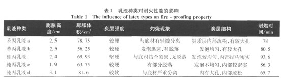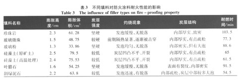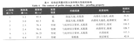 2.4珍珠巖的用量對耐火性 能的影響 在膨脹型防火涂料里,無機填料的用量會直接影響到炭質層的膨脹效果、炭層強度、炭層形態(tài)等。加入少量的填料可以顯著提高炭層的強度,提高耐火極限;但是,若是填料加入過量,會對炭層產生嚴重的抑制作用,從而大大降低了耐燃時間。 本次試驗著重考察了珍珠巖的用量對防火涂料耐火性能的影響,按照珍珠巖所占涂料體系質量分數(shù)的1%、3%、5%、7%、9%、11%從,分別制備了6組涂料,其實驗結果如表4。