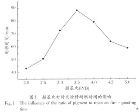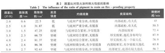 從表1可以看出,以上述5種不同的丙烯酸乳液作為成膜物質都具有較為理想的發(fā)泡效果,其膨脹倍率都能達到15倍左右,其中以純丙乳液d為基料,涂層膨脹倍率甚至能達到18倍,這說明丙烯酸乳液與膨脹阻燃體系具有一定的匹配性;但是,以苯丙乳液和純丙乳液為基料,在遇火灼燒的過程中發(fā)現(xiàn)涂層與鋼板底材都會有不同程度的分離或者具有脫落現(xiàn)象,這一方面是由于這兩種基料樹脂的軟化點較低,且與膨脹阻燃體系( PER、MEL、APP)三者的分解溫度相差很大,當涂層遇火灼燒時,膨脹阻燃體系還未完全脫水、炭化,形成致密炭質層,涂層就已開始軟化,成“沸騰狀”,從而導致其高溫附著力較差;另一方面,在膨脹炭質層內部存在較大的氣孔結構,當灼熱的火焰氣流不斷沖擊炭質層表面時,炭質層首先被氧化成白色的無機層,之后被火焰擊穿而導致小面積脫落;但是由于都是部分脫落,底部仍殘留一層致密的隔熱耐火層,起到脫落后期防火作用,延長了耐燃時間。而以硅丙乳液為基料,當涂膜遇火灼燒時,一般是硅原子上的有機基團發(fā)生氧化斷裂分解,形成的無機硅氧主鏈結構能使它與底材在高溫時緊密結合,而不會發(fā)生分離現(xiàn)象。因此,從炭質層的形貌結構和耐燃時間來看,硅丙乳液可以作為較為理想的成膜物質。 2.2顏基比對防火涂料防火性能的影響 在涂料中,顏料與基料是重要的組成部分,在顏料和基料已經確定的條件下,涂層的結構與性能往往取決于兩者之間的比值。從膨脹阻燃機理來看[8],顏基比太高或者太低都不利于涂膜達到最佳的綜合性能,因此,在防火涂料的配方設計中,顏基比往往存在一個臨界平衡值,當顏基比達到這個數(shù)值時,防火涂料具有最佳的耐火性能。為此,本實驗考察了顏基比對防火涂料耐火性能的影響,其實驗結果如表2和圖l所示。 從表2可以看出,隨著顏基比的增加,膨脹炭質層的膨脹高度、炭化體積以及炭層強度都有逐漸增大增強的趨勢,這是因為隨著顏基比的增加,顏填料不斷增加,膨脹阻燃體系在涂料中的含量也不斷提高,這必然導致涂膜將具有更多成炭的物質基礎,因而遇火能表現(xiàn)出更佳的膨脹效果,產生更多的炭化物,也使得炭質層愈發(fā)堅固,抵御火焰氣流的沖擊。從圖l可以看出,耐燃時間與顏基比的關系曲線成單峰狀,即隨著顏基比的增加,耐燃時間經歷了一個先增大后減小的過程,當P/B=3.5時,耐燃時間達到峰值。這主要是因為當顏基比較小時,基料樹脂的含量過大,其一方面會抑制涂膜的膨脹發(fā)泡,另一方面也會使涂層在遇到火焰灼燒時易發(fā)生熔融墜落,同時,膨脹阻燃體系含量過低,這些因素共同造成涂膜在較低顏基比時的耐火性能不理想。但是,顏基比過高時,基料樹脂的含量過低,會降低涂膜與底材的附著力,在遇火高溫時與底材發(fā)生分離,而且過少的樹脂也難以捕捉到發(fā)泡的氣體,在炭質層中易形成較大的泡孑L,同時,膨脹阻燃體系過多,一方面發(fā)泡迅速,會使得炭質層更加密實、厚重,但是也會讓涂層在高溫時的附著力降低,從而影響其耐火性能。因此,存在一個合適的顏基比,基料樹脂與膨脹阻燃體系的比例匹配,能使涂層具有最佳的耐火時間。根據(jù)實驗結果,當P/B=3.5時,涂層的耐火時間達到最佳值。