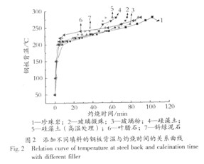 結合表3和圖2可以看出,添加不同無機填料對防火涂料耐火性能的影響具有明顯的差異。玻璃微珠的加入使得防火涂料在耐火階段的前期、中期表現(xiàn)出良好的隔熱效果,這是因為玻璃微珠本身的多孔結構就具有隔熱作用,大量的玻璃微珠在一起就形成了隔熱層,延緩鋼板背溫的上升;但是玻璃微珠對炭質層強度的提高不是很明顯,并且降低了膨脹高度,這可能是因為它對炭質層的膨脹具有一定的抑制作用,造成內部結構有點疏松,因此炭層逐漸被擊穿造成后期鋼板背溫迅速升高。玻璃粉的加入進一步降低了炭質層的膨脹高度,但是卻提高了炭質層的強度,這是因為玻璃粉在高溫下會發(fā)生熔融,覆蓋在炭質層中起到粘附作用,提高了炭質層的致密程度和強度,起到了高溫隔熱的作用。硅藻土同樣具有多孔隔熱作用,因此鋼板背溫在防火早期升溫較慢,但是硅藻土的加入卻使炭質層表面有裂紋且結構疏松,這是因為硅藻土不能有效地增強炭質層的強度,造成氣體從內部急劇沖出,使得炭層表面開裂、不平整,內部結構不緊湊。葉臘石和斜綠泥石都是耐火材料,它們的加入都表現(xiàn)出在高溫具有較好的隔熱防火性能,但是加入葉臘石與加入斜綠泥石相比,葉臘石的加入降低了膨脹高度,提高了炭質層的強度,延長了耐燃時間,這可能是因為葉臘石對炭層具有強烈的增強作用,不但提高其強度,并且提高了與底材結合程度,增強了耐燃效果;而斜綠泥石卻不能有效地提高炭層強度,造成炭層在灼燒過程中發(fā)生脫落,降低了耐火效果。而加入膨脹珍珠巖,炭層強度堅硬,內部厚實、致密,在灼燒過程中沒發(fā)生脫落,這是因為珍珠巖一方面具有隔熱耐火作用,有助于提高耐燃時間;另一方面,珍珠巖在高溫下也能發(fā)生膨脹,它們穿插在炭層結構中,增強了炭層的致密性。因此,根據(jù)實驗結果,選擇珍珠巖作為防火涂料的增強填料。