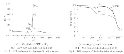 由圖2可見,Si02粒徑分布較窄,主要集中在30~50 nm之間。 圖3、圖4分別為GPTMS修飾和GPTMS未修飾的納米二氧化硅的DTA-TG曲線。 由圖3(a)可見,