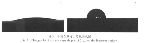 接觸角是評價材料表面憎水性能的一個指標。相比未處理的樣品接觸角(20°),試樣經過疏水納米二氧化硅保護涂料處理后,接觸角大大的增加(93°)。圖5為水滴在未處理的石材和用3種防護材料處理后石材表面的視頻截圖。