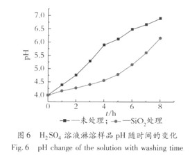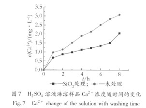 從圖5中可以清晰地看出,水滴鋪展在未處理的石材表面上(圖 圖6、圖7為疏水性納米二氧化硅防護涂料處理后的石材樣品經過8h酸雨腐蝕后,pH和Ca2+濃度隨時間的變化圖。
