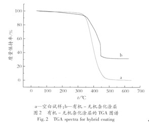 2.2有機一無機雜化涂層熱重分析 圖2為氨基改性硅溶膠相對于環氧樹脂的質量分數為5%的情況下,得到的有機一無機雜化涂層對比純環氧涂層的熱重曲線。