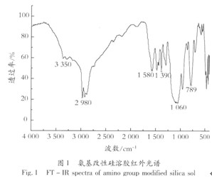 2 結果與討論 2.1 氮基改性硅溶膠紅外分析 圖1為氨基改性硅溶膠的紅外光譜圖。 從圖1可知,在