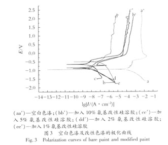 從表2的實驗結果看,涂層表干速度排列順序(從快到慢)依次為:空白→1%→2%→5%→10%。當相對含量為10%時,涂層硬度低且表干時間很長,不符合工程流水線工作需要。其他雜化涂層的力學性能較好。雖然Si-O-Si鍵長較長,鍵角較大,漆膜的柔韌性提高,但在一定比例下,體系硬度并不因為氨基改性硅溶膠的加入而有所降低。 2.5 涂層耐腐蝕性分析 圖3為空白環氧色漆及硅溶膠改性環氧復合涂料的極化曲線。 觀察圖3中的曲線可看出,加入不同量的硅溶膠改性的環氧色漆與空白環氧色漆有很大的區別。在硅溶膠改性的環氧色漆中,加入5%和2%的氨基改性硅溶膠的改性色漆比其他配比的改性色漆有著明顯的區別。首先,加入5%和2%的氨基改性硅溶膠的改性色漆比空白環氧色漆的開路電位電壓(EOC)要高。開路電位電壓變高的原因是陰極反應的有效抑制(Si02的等電點低,在pH >2時會出現負表面電荷)。其次,加入5%和2%氨基改性硅溶膠的改性色漆的鈍化區的電流強度比空白環氧色漆的鈍化區的電流強度要低,這可以說明在阻止電化學腐蝕過程中,氨基改性硅溶膠改性的色漆涂層確實提供了一個物理屏障。加入5%氨基改性硅溶膠的改性色漆的物理屏障在大約530 mV的高電位會失去作用,而加入2%氨基改性硅溶膠的改性色漆的物理屏障在大約580 mV的高電位會失去作用。在加入5%氨基改性硅溶膠的改性色漆中,當電位增加到開路電位電壓E。.,電流開始快速增大,這說明進行了活躍的電化學反應。在電流大約10-8.2A/crr12時,電流增加會變慢,這說明可能形成了鈍化層。電位的持續增大結果是電流密度的快速增加。而在加入2%氨基改性硅溶膠的改性色漆中,在電流大約10-6.5A/cm2時,電流增加會變慢,這說明可能形成了鈍化層。再次,加入5%和2%的氨基改性硅溶膠的改性色漆的開路電位電流要比空白環氧色漆要小得多。通過圖3可看出,相比空白環氧色漆及其他配比的改性色漆,加入5%和2%的氨基改性硅溶膠的改性色漆的防腐蝕性能有著極大的增強。