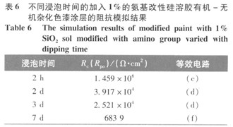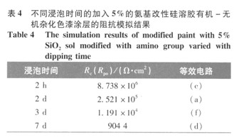 從表3~7可以看出,加入氨基改性硅溶膠的量對環氧改性色漆涂層防腐蝕性能有較大影響。當加入的氨基改性硅溶膠的量較少時,在環氧樹脂基體中生成的納米Si02分散較均勻,說明有了KH-550的作用,生成的Si02與環氧樹脂發生了化學鍵的連接,顆粒與基體間的界而作用增強,從而沒有出現團聚現象。當KH-550的用量增大時,改性環氧涂料的黏度有大幅度的提高,這可能是由于氨基與環氧基團反應所形成的擴鏈的結果。隨著加入的氨基改性硅溶膠的量增大,生成的納米Si02顆粒粒徑逐漸變大,且有可能出現團聚現象,所以其防腐蝕性能會降低[8]。從5個表的涂層擬合結果可以看出,加入5010的氨基改性硅溶膠的環氧改性色漆涂層防腐蝕性能比其他配比有著很大的提高。