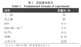 先將計量的丁二烯和苯乙烯在室溫下攪拌乳化0.5 h。再將計量納米Ti02超聲分散在質量分數約20%的預乳化液中,并轉移至帶有回流冷凝管、攪拌器的三口燒瓶中,加入引發劑總質量的20%,快速攪拌并升溫至 將上述制備的核乳液保溫在