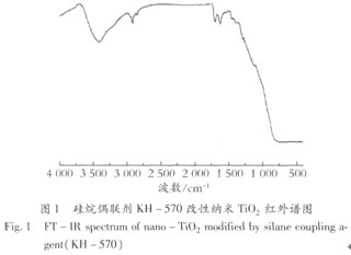 1.3性能測定 將稀釋的乳液染色后浸涂在銅網上,室溫干燥后用場發射透射電子顯微鏡觀測其形貌;用FT-IR-650傅里葉紅外光譜儀測定其紅外光譜;取10mL乳液用質量分數為5%的CaClz滴定,觀察是否出現絮凝、破乳現象,以考察其穩定性; 用100目不銹鋼網過濾絮凝物,烘干稱質量;乳液固含量、黏度分別按GB/T 2793-1995、GB/T 2794-1995進行測定;漆膜耐沖擊性、鉛筆硬度、耐水性、耐洗刷性及附著力分別按GB/T 1732-1993、GB/T 6739-1996、GB/T 9274-1988、CB/T9266-1988、GB 1720-1979進行測定。 2結果與討論 2.1 核殼結構納米Ti02/PSB粒子結構分析 圖1為納米Ti02經KH -570改性后的紅外譜圖。 Ti-0鍵的主要特征波帶是500~780cm-1,3428 cm-1強吸收峰歸屬于-OH基的振動,1060 cm-1處的吸收反映了Si-O-Si結構的存在,2900 cm-1、l 455 cm-1、1400 cm-1附近的吸收峰歸屬于CH3一、一(CH2)n一的存在;1290 cm-1附近的吸收峰歸屬于C-O基,1635 cm-1處吸收峰反映C-C雙鍵存在,而1719 cm-1處吸收峰表示酯基存在的,從圖譜可知偶聯劑KH -570已成功接枝到納米Ti02粒子上。